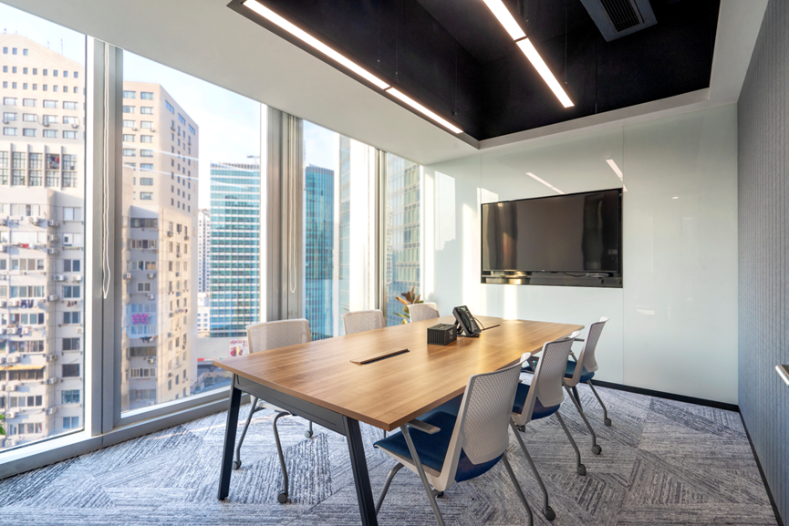 前廳的后方是一個(gè)可容納二三十人的大會(huì )議室。會(huì )議室是局部裸頂設計,中間四處散開(kāi)的條形燈,賦予了整個(gè)空間詩(shī)意和藝術(shù)氣息。地面上的漸變灰白色地毯為線(xiàn)性散發(fā),相互交織。原有的柱子鋪貼了灰色背漆玻璃,可以在會(huì )議時(shí)進(jìn)行記錄或書(shū)寫(xiě)。與旁邊的灰色柜體相結合,看起來(lái)宛如本應該如此一般,更加耐看性和融入感。大會(huì )議室與其他會(huì )議不同,由于空間大,設有移動(dòng)會(huì )議系統,使用起來(lái)更加便捷。