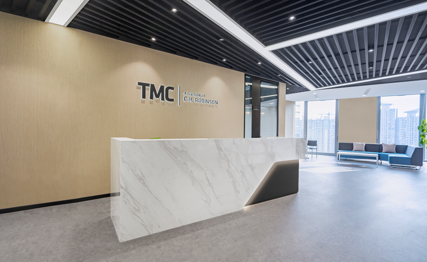 進(jìn)入前廳,立刻感受到TMC羅賓升的創(chuàng )意氛圍。木紋飾面、隱隱懸浮在墻面的黑色LOGO和白色石材的前臺相得益彰,灰色地面的襯托使整體略顯干凈和高雅。條形燈把格柵吊頂分隔開(kāi)來(lái),增添了細節又體現了企業(yè)布局與世界各地的文化形象。